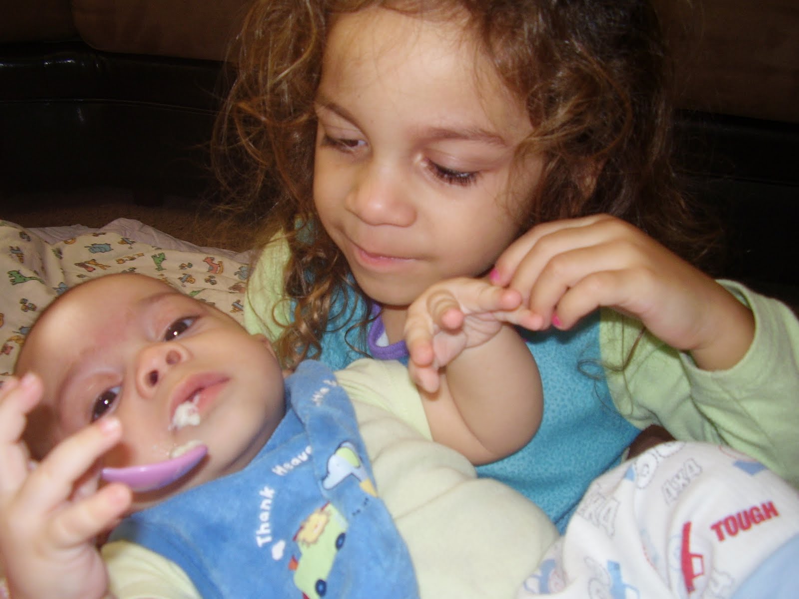Bryan has started eating cereal, Ana Elisa and Brittney love to help feed him.